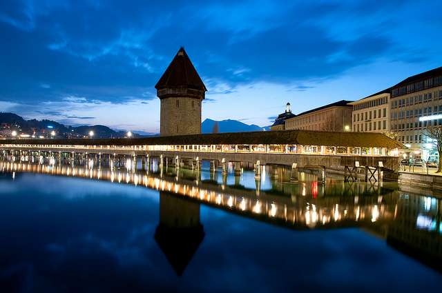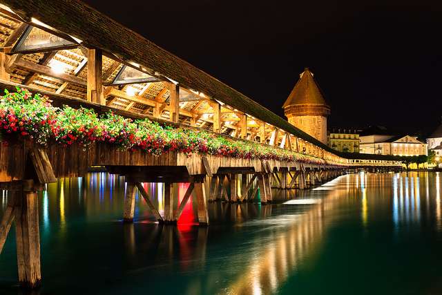 瑞士琉森最負(fù)盛名便是卡佩爾廊橋Chapel Bridge(Kapellbrücke)又叫教堂橋,這是盧塞恩的標(biāo)志,始建于1333年,也是歐洲最古老的有頂木橋,橋的橫眉上繪有120幅宗教歷史油畫,沿途還可欣賞描述當(dāng)年黑死病流行景象的畫作。