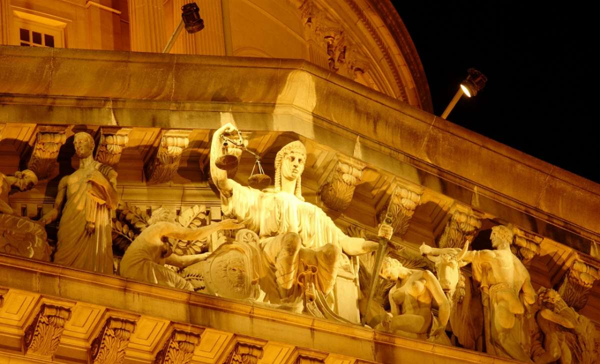 最高法院正面山墻飾內(nèi)三角面部分的雕塑,中間部分的人物代表公正,左側(cè)人物代表迷失者,正向前者乞求保護。版權(quán)所有山東聊城聊之旅國際旅行社有限公司,轉(zhuǎn)載必究!人物的旁邊有兩位立法者,手中拿著書本,代表法律。代表公正人物右側(cè),有另一人物,鞠躬感恩,后面跟著的是一個人和一頭雄牛,代表財富與繁榮。另有兩個孩童,手持小麥一把,代表法律與公正所帶來的豐盛生活。