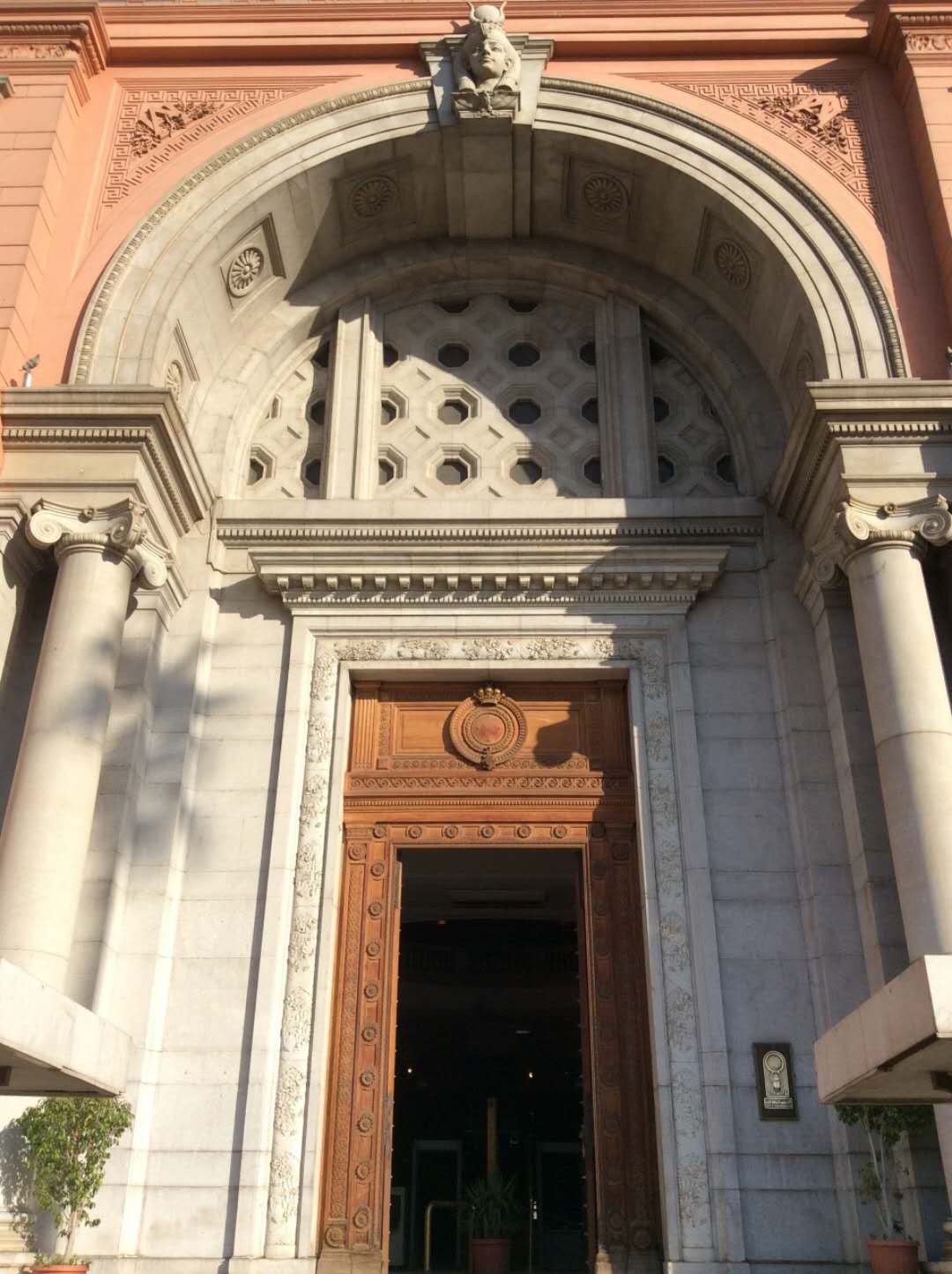 博物館入口的設(shè)計(jì)融入了古埃及藝術(shù)的特征:大門的外廓是一個(gè)圓形拱門,拱門兩側(cè)的壁龕中各有一個(gè)將法老形象歐式化的浮雕,其中一個(gè)持有紙莎草,另一個(gè)持有蓮花,分別象征古代埃及的南北方。
