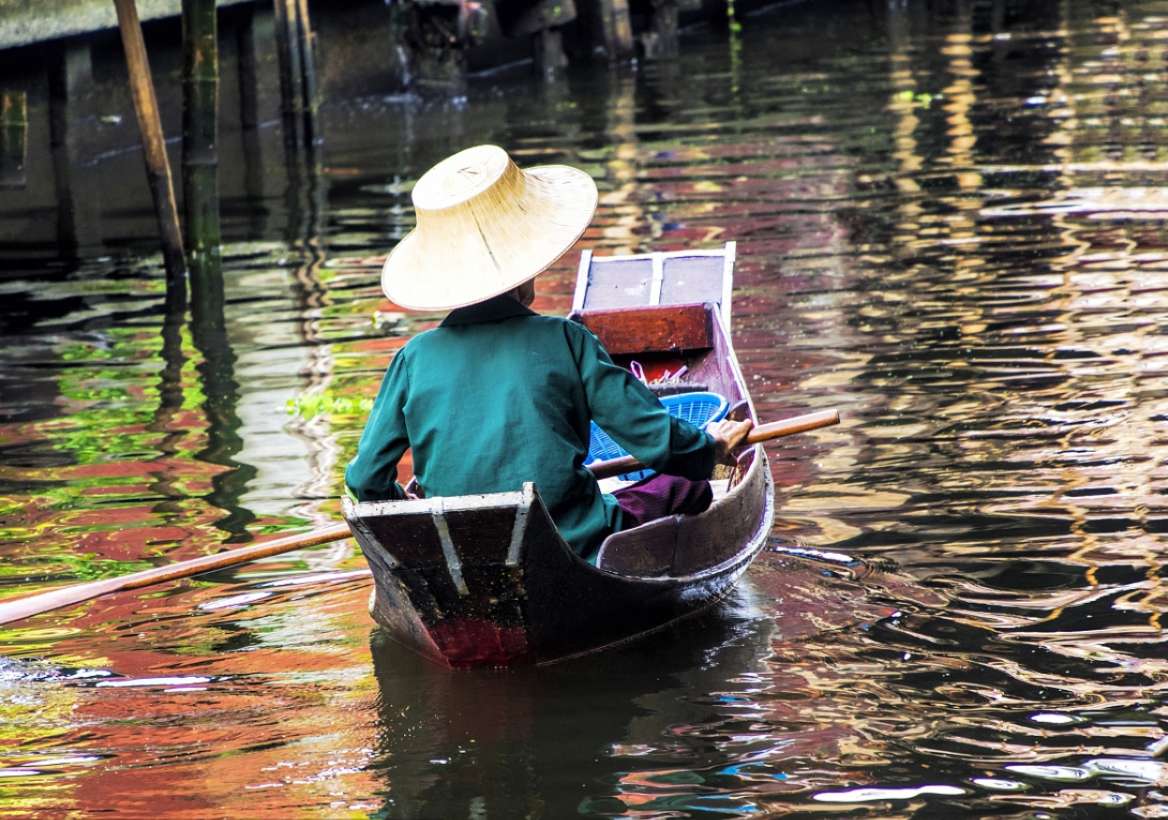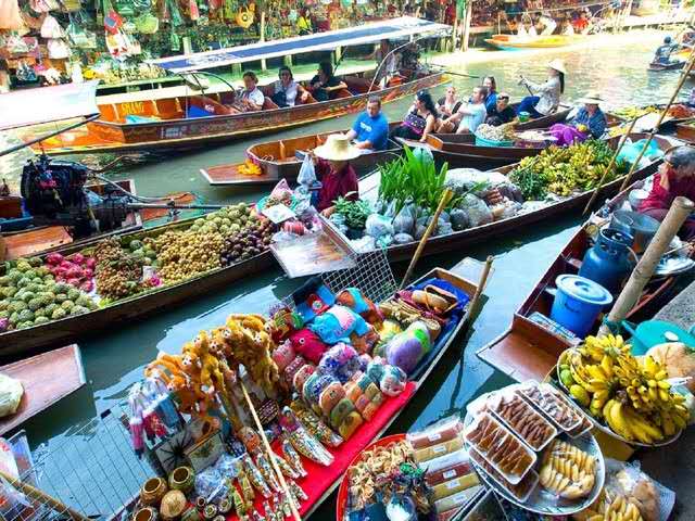 每天早上約7點(diǎn)到9點(diǎn),是當(dāng)?shù)厝私灰鬃铑l繁的時(shí)候,會(huì)有一艘接著一艘的小船從附近駛來,賣時(shí)蔬水果、干貨、小吃、鍋碗器皿、草帽等,在船上煮米粉、剖椰子都是輕而易舉的事情。店家各持一艘船,景象實(shí)在壯觀。約莫10點(diǎn)左右,除了小販的船外,更多了載觀光客的船,有時(shí)河道可能也會(huì)被擠得水泄不通,出現(xiàn)難得的「塞船」景象,不過這里有水上警察吹哨音指揮,紓解交通,很快就能讓河面再度活絡(luò)起來。