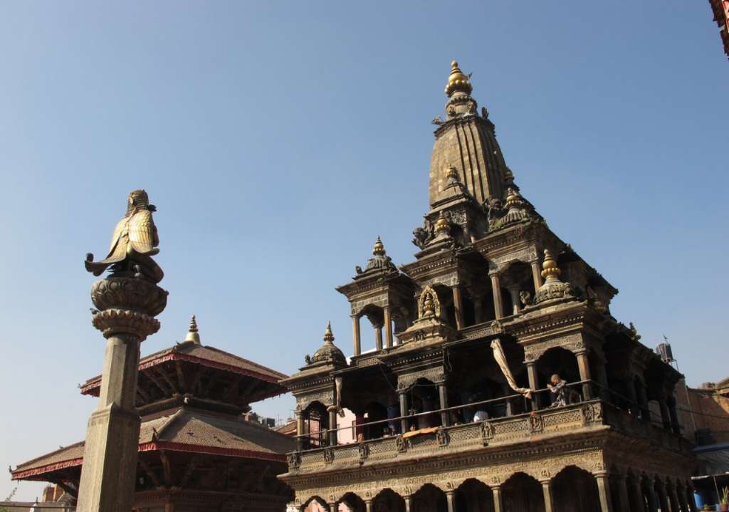 傳說這座廟的名字就是尼泊爾名字的由來,而這座廟宇也是杜巴廣場上最古老的建筑。在尼泊爾語中,加塔曼達(dá)表示“木頭建造的集會建筑”,所以這座廟又叫“獨木廟”。顧名思義,這座建筑建造初期的用途是供人們休息集會之用,后來改為廟宇,供奉哥拉納神。這座廟宇也非常熱鬧,每天一早,小販們就在廟門口擺滿了鮮花,出售給進(jìn)廟祭祀的人們。
