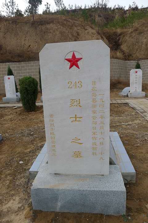正面朝北、東西走向的深紅色大理石陵墓上,稍靠西側(cè)陳設(shè)著鋼盔和軍旗的青銅雕塑,造型簡潔明快,蘊意肅穆深長。墓前有一個凸型五星狀的火炬,五星中央噴出的火焰,從建成時一直燃燒,從未熄滅,它象征著烈士的精神永遠(yuǎn)光照人間。