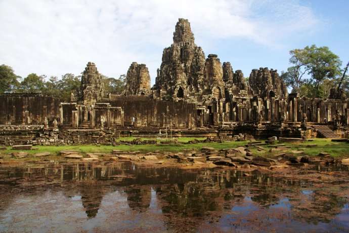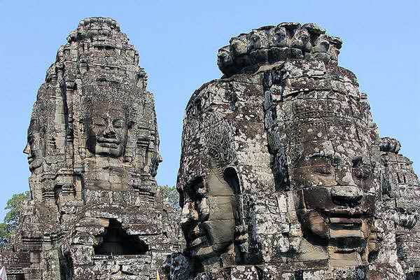 巴戎廟 位于柬埔寨暹粒,吳哥城內(nèi)最為出名的要數(shù)巴戎廟中的佛塔了,巴戎廟位于吳哥城的中心位置,巴戎廟是由一組共49座小寶塔圍繞中央尖塔構(gòu)成的建筑群,這些塔在佛語里又被稱做浮屠,每一座塔的四面都雕刻著巨大的佛面,也正因為如此,這些塔又被稱作佛面塔,上面的佛被稱為四面佛。