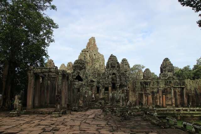 在茂密的叢林中,千回百轉(zhuǎn),灰白的石柱后,一個又一個黑白相間的斑駁石塔讓人又重回古代神秘圣土,四面佛那慈祥安定的臉部透出一份寧靜與優(yōu)雅的神秘,拾起記憶的殘片,體會時光交錯的震撼……