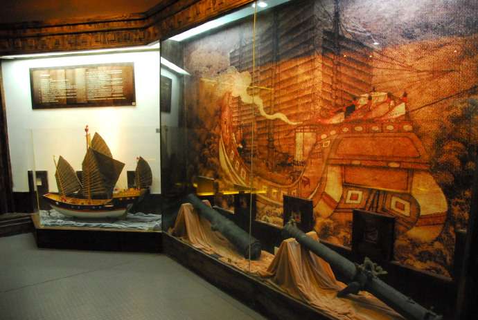 在陳列櫥里,有鄭成功佩帶的玉帶、龍袍殘片、鞋子、圖章等遺物。在詩畫資料中,有鄭成功的詩作及其手書、《鄭成功與王忠孝對(duì)奕圖》、《海上見聞錄定本》、延平王戶官楊英的《先王實(shí)錄》以及《稗海紀(jì)游》等,其中《海上見聞錄定本》(共兩冊(cè))是1960年在同安發(fā)現(xiàn)的一部抄本,是非常珍貴的歷史資料。此外,還有雙龍銅炮,以炮身飾有兩條游龍而命名的。