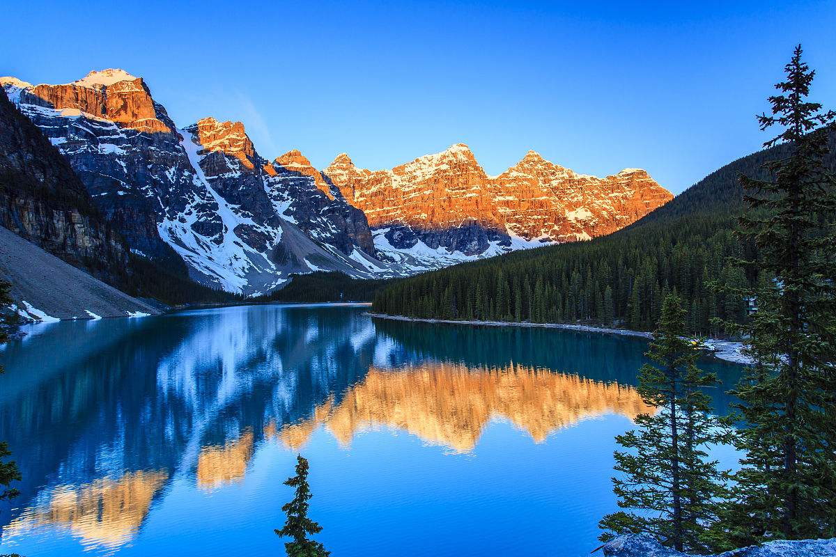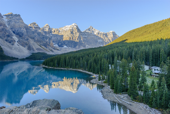 由于夢蓮湖是一個冰川湖,因此只有到每年六月底,湖水才到達(dá)最高線,折射沉積的巖粉,呈現(xiàn)出美麗的藍(lán)綠色。夢蓮湖被世界公認(rèn)為是最有拍照身價的湖泊。湖面呈寶石藍(lán)色,晶瑩剔透,在鋸齒狀的山谷的擁環(huán)下,就像一塊寶玉。這塊“國寶”被印在加拿大20元的紙幣上。