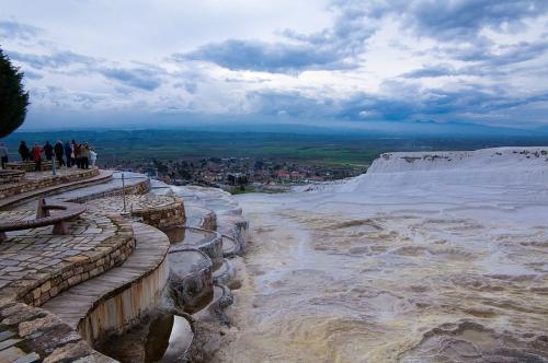 從平原之上200米高的巖石中流出的泉水和水中的方解石形成了帕姆卡拉(土耳其語中意為“棉花宮殿”)這一特殊地貌。它由石林、石瀑布和一系列的梯形盆地組成。公元前2世紀(jì)末阿塔利德斯王朝的帕加馬國王們建立了希拉波利斯溫泉站。這處遺址包括浴室的廢墟、廟宇和其它希臘建筑。