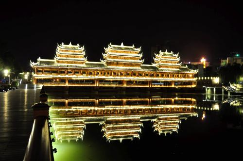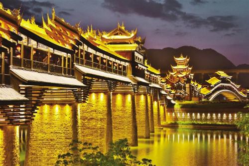 黔江濯水古鎮(zhèn)風(fēng)雨橋橫跨于阿蓬江上,長(zhǎng)303米、寬5米,據(jù)說(shuō)是亞洲最長(zhǎng)的廊橋,分為橋、塔、亭三部分。濯水古鎮(zhèn)風(fēng)雨橋橋身為純木制結(jié)構(gòu),建筑材料之間以榫頭卯眼互相穿插銜接,直套斜穿,結(jié)構(gòu)牢固精密。橋建有三層塔亭,兩側(cè)有約百扇可自由開(kāi)合的雕花木窗,橋內(nèi)擺放有紅漆長(zhǎng)凳。