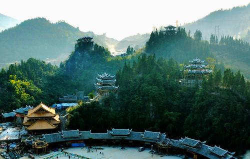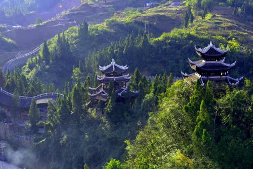 九黎宮:科學(xué)利用山水自然資源,因地制宜、依山造勢(shì),順山而居。宮高99米,呈11開間,象征九九歸一之意。建筑由四合院到吊腳樓到?jīng)_天樓三合為一,九黎宮內(nèi)有苗族接龍?zhí)谩駱腔⒖谔?、四合院、八字朝門和吊腳樓群等多種文化符號(hào),是彭水展示苗族文化、民風(fēng)民俗的博物館,是目前最大的吊腳樓群。
