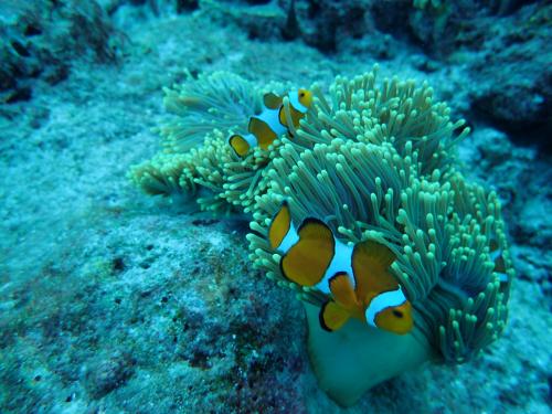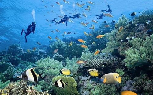 涉足觀魚:即使沒有受過潛水訓(xùn)練,也絕對可以享受潛水觀魚的樂趣。戴上面罩,撲在海面上向下看,近距離欣賞美麗的珊瑚,五顏六色的熱帶魚從身邊游過,尤其是紅色的大魚,很讓人驚奇,30米外便有如懸崖般的落差,但這里也是魚兒最多的地方。在陽光的照射下,海底世界美得如夢如幻。一會兒,一大群黑色的魚群游過來,不一會兒又有一大群白魚從身邊穿過。運氣好的話,可見到小鯊魚和魔鬼魚。
