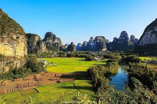 明仕田園位于靠近中越邊境的廣西省崇左市大新縣堪圩鎮(zhèn),距離南寧210公里,距離著名的德天大瀑布37公里。由于明仕田園距離大海不遠(yuǎn),又位于北回歸線以南的熱帶地區(qū)。這里一年四季高溫多雨,以石灰?guī)r為主體的山脈很容易受到水的侵蝕,大自然就以自己的偉力雕塑了明仕田園的喀斯特地貌。在大自然無(wú)聲寂靜的歲月流逝中,明仕田園的山總是傍著水,水總是環(huán)繞著山,山總是點(diǎn)綴著水,水總是倒映著山,形成了處處奇峰、山水相映的中國(guó)山水。有人放言,在名仕田園沒(méi)有真正的攝影家,因?yàn)殡S便一拍,皆是風(fēng)光迤邐的水墨山水。