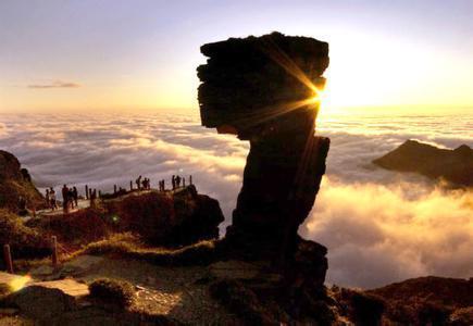 佛光:每逢雨后初晴的上午9時(shí)前或下午4時(shí)后,在與太陽相對(duì)的云霧中出現(xiàn)五彩光環(huán),中嵌人影,人動(dòng)影動(dòng)。在火光照耀的夜晚,濃霧中還會(huì)出現(xiàn)比人高大數(shù)十倍的投影,即幻影。梵凈山紅花綠葉四季不敗,珙桐、杜鵑、玉蘭等在茫茫林海中亭亭玉立,一年四季輪番開放。數(shù)百年來,湘、鄂、川、黔、贛、滇、閩及東西各國善男信女前來朝拜,絡(luò)繹不絕,“崔巍不減五岳,靈異足播千秋”,“若城市然”。