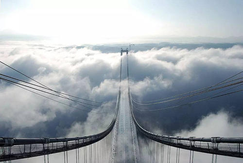 主橋?yàn)橹骺?196米的雙塔單跨簡(jiǎn)支鋼箱加勁梁懸索橋,大橋主纜分跨布置為320米+1196米+320米,橋面寬33.5米。