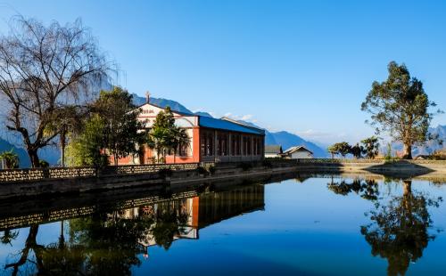 老姆登教堂,青磚墻,紅漆木窗,白鐵皮屋頂,簡單樸素。從外表看,這座教堂并不壯觀,沒有常見的玻璃彩窗、穹頂、和標志性的哥特式尖塔,有的只是長條凳和紅漆木窗,但這更顯出人們信仰的純粹和虔誠。每個星期天(周三、周六晚上八點亦有),周邊鄉(xiāng)村的基督教信徒都會集中在這里做禮拜,他們聚集在這里虔誠的念誦贊美詩,對于那些和著太陽和泥土味道的樸實的人民,上帝就住在他們心里,他們像呼吸一樣自然安詳虔誠的哼出那些歌謠。村民唱圣歌是用傈僳語唱的,傈僳族的文字始自圣經的翻譯,也為怒族所共用。
