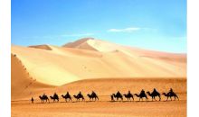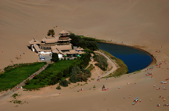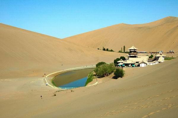 鳴沙山位距敦煌市南郊5公里,因沙動成響而得名。山為流沙積成,分紅、黃、綠、白、黑五色。漢稱沙角山,又名神沙山,魏晉時始稱鳴沙山。其山東西綿亙40余公里,南北寬約20余公里,沙壟相銜,盤桓回環(huán)。其特點:“峰巒陡峭,山脊如刃;馬踐人馳,殷殷有聲;輕若絲竹,重如雷鳴;沙隨足落,經(jīng)宿復(fù)初?!?/p>