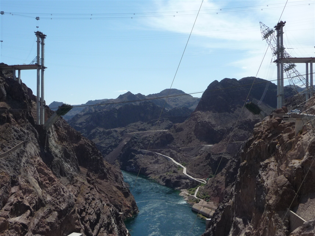 胡佛水壩--俯視胡佛水壩(Hoover Dam)位于亞利桑那州的西北部,93號洲際高速公路上,內(nèi)華達州及亞利桑那州的西北部交界處,從拉斯維加斯出發(fā)向東南方向行駛約40公里處。工程龐大,建成后對工農(nóng)業(yè)發(fā)展起著巨大的作用。因此它在世界水利工程行列中占有重要的地位。胡佛水壩的建造耗費了大量資金,動員了大批人力,于1936年竣工并交付使用。它是一座拱門式重力人造混凝土水壩。壩高220米,底寬200米,頂寬14米,堤長377米。這樣巨大的水壩在世界上是不多見的,它宛如一條巨龍盤臥在大地上,顯得十分威武。