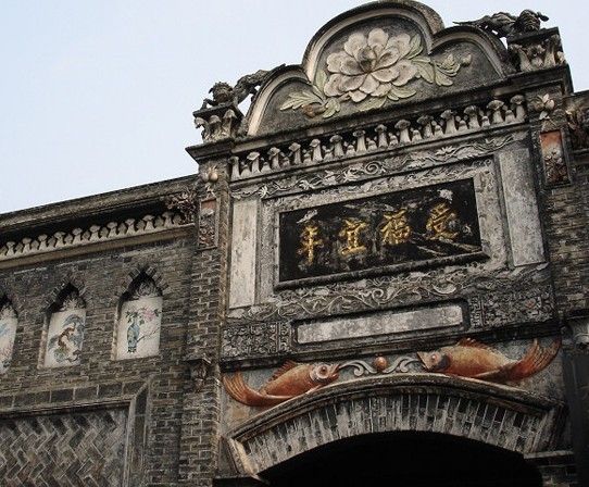 老公館大門整體足有兩層樓高,主體為灰磚墻,勾白縫。一對(duì)朱砂色石獅雄踞兩側(cè),黑漆木門門楣上一對(duì)紅色鯉魚相向翹尾,兩個(gè)魚嘴似在爭(zhēng)搶中間的白珠。其上有四個(gè)描金大字——受富宜年,襯了黑底,兩側(cè)拉白瓷條飾。最上部為凸型拱邊,居中一朵粉紅色牡丹浮出墻面。整座大門裝飾繁復(fù),色調(diào)沉穩(wěn)大方。