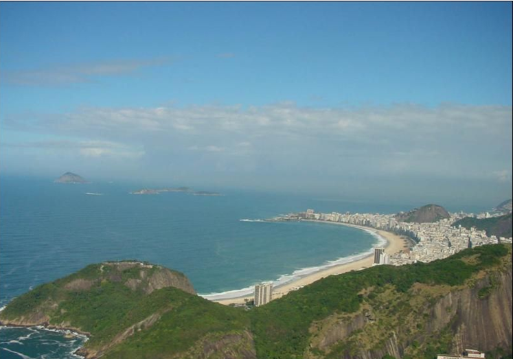 遠(yuǎn)處,一條長龍飛架海灣兩岸,那是著名的尼泰羅伊大橋。這座大橋全長十四公里,把里約與對岸的尼泰羅伊市連結(jié)在一起;這一邊是浩如煙海的大西洋,波光粼粼的海面上不時(shí)地駛過巨大的海輪,三三兩兩形狀各異的小島在海浪潮水的拍擊下,時(shí)隱時(shí)現(xiàn)。遠(yuǎn)處,科帕卡巴納海灘像一彎新月,橫臥在大西洋身旁,五顏六色、南來北往的小汽車宛若無數(shù)的甲殼蟲在月牙般的海濱大道上緩緩爬行……