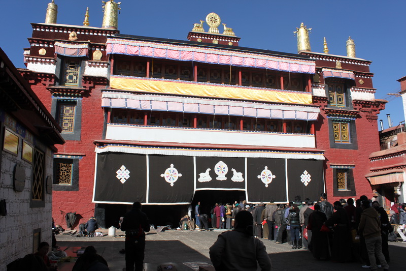 凈室門口兩側還供有四大天王泥塑像。最后部是佛殿,內(nèi)2柱,無柱礎,面積23。5平方米。大柱表面用麻繩纏繞之后又用2~3厘米的泥皮涂抹,可能是防腐、防火的措施。柱頭雕有蓮花寶座,柱頭小栱上則無裝飾,具有明顯的早期特點。四壁的壁畫多為線描盤腿坐形象,筆法流暢生動。大殿的墻壁均用大石塊夾小石片砌成,厚1~1。3米。殿內(nèi)供有尼泊爾墀尊公主帶來的銅鎏金不動金剛佛和八大隨佛弟子泥塑像,以及兩大忿怒力士、宗喀巴塑像。佛殿后部和兩側還繞以密閉回廓,偏窄、較高,具有早期布局特征。神殿第二層前前為僧舍,中部為大經(jīng)堂天井,天井之后為供佛大殿,6柱,內(nèi)供桑杰魯王甲后、十六尊者及經(jīng)書;里面還有一大殿,8柱,內(nèi)供藥師八如來和《甘珠爾》佛典,北面供奉有救度母及其他佛像。神殿第三層前面為達賴喇嘛到該寺的專用住房,共6間。后部則為金頂?shù)?,殿門向東,面積約54。5平方米,內(nèi)有明柱兩排8根,左右開小窗。殿左右及后部有一周狹窄回廓,以木欄相圍。金頂為漢式風格,屬歇山式,以斗栱承托;金頂垂脊末端套有羯摩魚頭,是為套獸。殿內(nèi)門窗壁畫、柱子等則是藏式風格,體現(xiàn)了藏漢建筑的巧妙結合。