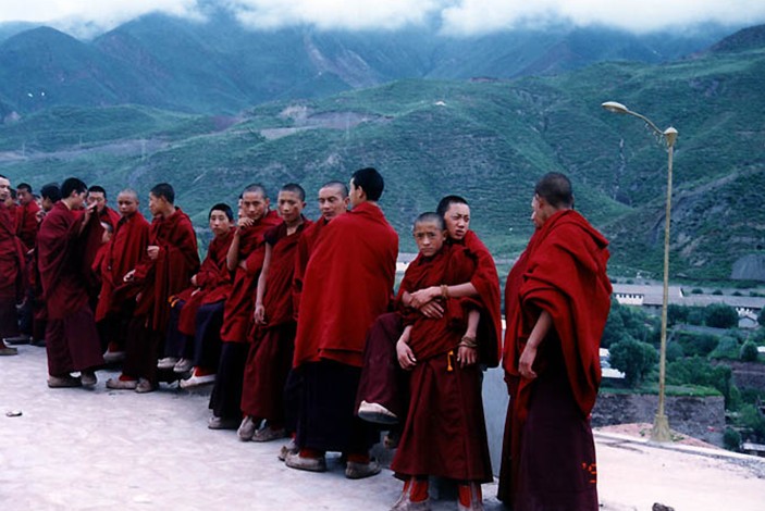 布久喇嘛林寺依山傍水,佛殿庭院掩映綠蔭之中,院內(nèi)藏犬成群。整個(gè)寺院形狀內(nèi)呈正四角,外底層屋檐共有二十角,第二到第三層屋檐為八角,佛殿高20余米,內(nèi)徑10余米,上覆金頂,呈塔形,四面墻體分以白蘭紅綠四色涂之,非常漂亮。喇嘛林寺有著名的蓮花生大師踐石遺跡,寺內(nèi)精美的壁畫(huà)也堪稱藏東一絕。