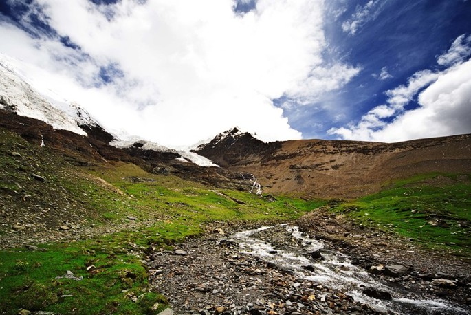 從羊卓雍錯(cuò)出來后,跨越4330米的斯米拉山口后就來到了卡若拉冰川的冰舌下。冰舌前沿海拔5560米,觀看卡若拉冰川的地方海拔約有5400米,在山口北面5600米左右的地帶,屬寧金抗沙峰冰川向南漂移后形成的懸冰川。