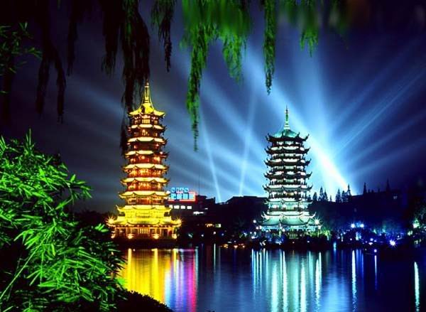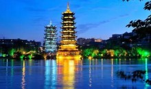 桂林日月雙塔號稱世界第一銅塔,是桂林旅游的一個絕美夜景觀賞地。地處桂林市中心區(qū),座落在桂林城的中軸線上,與“象山水月”相鄰。象山是桂林的城徽,而雙塔則是新桂林的標識。其中日塔高41米共九層,通體均為純銅裝飾,耗用銅材350噸,金碧輝煌,并有電梯供游客觀光乘坐。銅塔所有構(gòu)件如塔什、瓦面、翹角、斗拱、雀替、門窗、柱梁、天面、地面完全由銅壁畫裝飾,整座銅塔創(chuàng)下了三項世界之最——世界上最高的銅塔,世界上最高的銅質(zhì)建筑物,世界上最高的水中塔。 月塔高35米共七層,為琉璃塔。每層的雕花彩繪門窗寓意不同的主題,富含中國傳統(tǒng)韻味,通過水下18米長的水族館與日塔連接,其地宮之中有桂林明代青花梅瓶大型壁畫。杉湖日月雙塔已成為觀賞桂林城市精華美景的勝地。