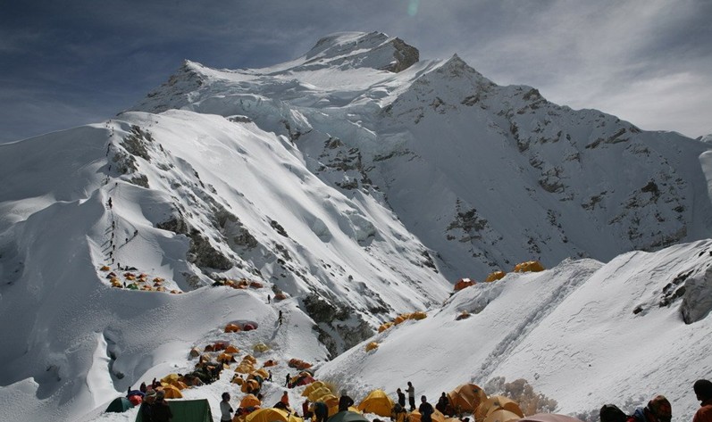 首先從拉薩沿南藏公路南行,經(jīng)日喀則和拉孜,行程718公里到達定日,再沿簡易公路南40多公里,就可到卓奧友峰北麓,直抵加布拉冰川末端的登山大本營。這里的海拔高度為4959米,地形開闊避風,且水源充足。