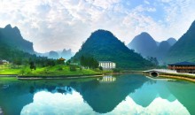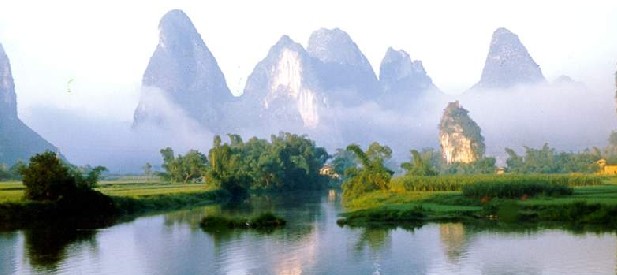 浪石風(fēng)光:在漓江左岸林茵翠海中,可見(jiàn)青磚黛瓦村舍依江而立,叫浪石村。到此,就進(jìn)入漓江景區(qū)的山水精華所在,兩岸奇峰羅列,水曲天窄,右岸有大黃山、文筆峰、筆架山、獅子山等,高低錯(cuò)落;左岸有觀(guān)音山、白兔山、金雞嶺等,千姿百態(tài)。游覽至此,但知船伴山行,不覺(jué)山回浪轉(zhuǎn),前望水穿江峽,旁視峽襯帆影;或則云遮霧繞,煙波渺渺,山川隱約,幻景天成。