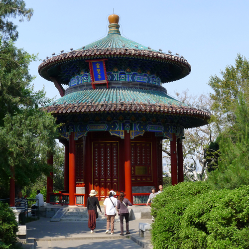 2.周賞亭。東側(cè)第一座亭??兹杆{(lán)琉璃筒瓦頂,紫晶色琉璃瓦剪邊,重檐圓攢尖頂。上檐重昂七踩斗栱,下檐單昂五踩斗栱,兩槽柱子,內(nèi)外各有八根。亭高約為11.3米,建筑面積近100平方米。內(nèi)原供五方佛之一的寶生佛(Ratnasambhava Buddha),為鑄銅鎦金佛像,被八國(guó)聯(lián)軍劫去。