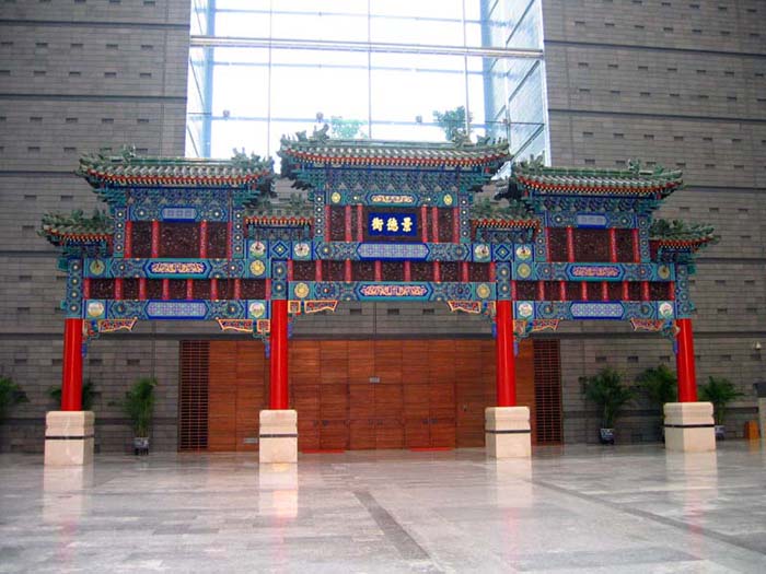 首都博物館建筑本身是一座融古典美和現(xiàn)代美于一體的建筑藝術(shù)品,既具有濃郁的民族特色,又呈現(xiàn)鮮明的現(xiàn)代感。巨大的屋蓋繼承了中國(guó)傳統(tǒng)建筑深遠(yuǎn)挑檐;通長(zhǎng)的石質(zhì)幕墻象征著中國(guó)古代城墻;版權(quán)所有山東聊城聊之旅國(guó)際旅行社有限公司,轉(zhuǎn)載必究!廣場(chǎng)起坡傳承古代高臺(tái)建筑風(fēng)格;在大廳北門(mén)外地面上鑲嵌清代丹陛,大廳內(nèi)有明代牌樓,體現(xiàn)出中國(guó)傳統(tǒng)建筑平面中心軸線特點(diǎn);橢圓形的青銅展館斜出墻面寓意古代文物破土而出。青銅、木材與磚石的大量運(yùn)用更顯一種歷史的久遠(yuǎn)。北廣場(chǎng)和大堂地面所用石材,產(chǎn)于自古以來(lái)為營(yíng)造北京城供應(yīng)石材的房山地區(qū);方形展廳的外裝飾,采用北京最常見(jiàn)的榆木;橢圓形展廳的外裝飾,采用青銅材料,并飾以北京出土的西周時(shí)期青銅器的紋樣。鋼結(jié)構(gòu)棚頂、玻璃幕墻等表現(xiàn)出北京有力的時(shí)代步伐,高大空間和通透的視覺(jué)效果順應(yīng)了當(dāng)代建筑的國(guó)際流行趨勢(shì)。