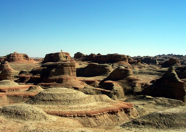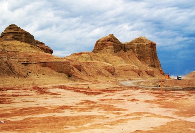 克拉瑪依市北行100公里,在烏爾禾鄉(xiāng)東南三公里,有一處獨(dú)特的風(fēng)蝕地貌,定名為風(fēng)城,人們習(xí)慣稱它為 “魔鬼城”。“魔鬼城”是一片雅丹地貌,面積10平方公里,地面海拔350米左右?!澳Ч沓恰笔且黄诺さ孛玻娣e10平方公里,地面海拔350米左右。雅丹,維吾爾語(yǔ)“雅爾丹”的轉(zhuǎn)音,原來(lái)是維吾爾族對(duì)沙土風(fēng)蝕地貌的叫法,意思是“陡壁的小丘”,后演變?yōu)楦珊档貐^(qū)風(fēng)蝕地貌的地理名詞。