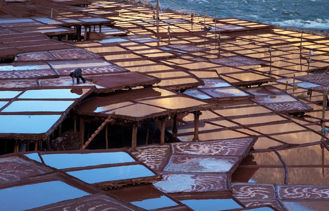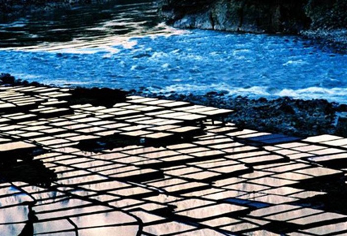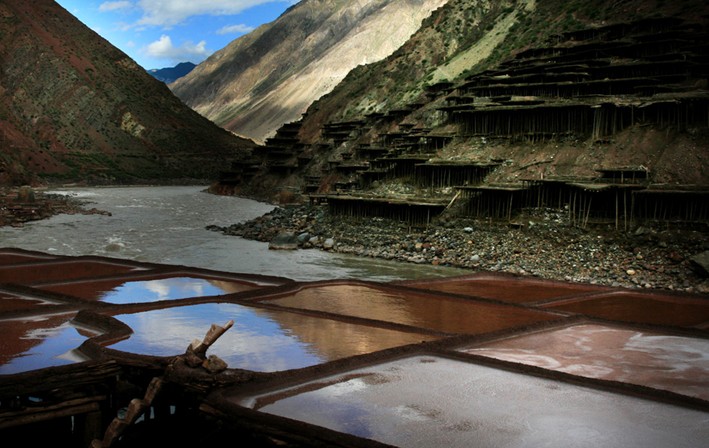 鹽井自古就有產(chǎn)鹽的歷史,而鹽田又成為這里獨有的一道人造景觀。所謂的鹽田,其實是在洶涌澎湃的瀾滄江邊搭建的一些土木結(jié)構(gòu)的平臺。順著鹽田之間的小道下坡,鹽水井就挖在江邊。這兒的鹽水井有的深近10米,工人們身背圓柱形的木桶,將鹵水存儲在鹽田邊的槽溝里,其他的工人將鹵水從槽內(nèi)舀出倒入鹽田里。經(jīng)過一天日頭的暴曬和江風(fēng)的吹拂,第二天,鹽田里就會結(jié)晶出白色的鹽粒了。 依山搭建層層的鹽田氣勢雄偉,鹽民們沿著祖先的足跡,走在崎嶇險峻的小道上辛勤地勞作,在延續(xù)生命的同時也創(chuàng)造著世界上獨特的景觀。