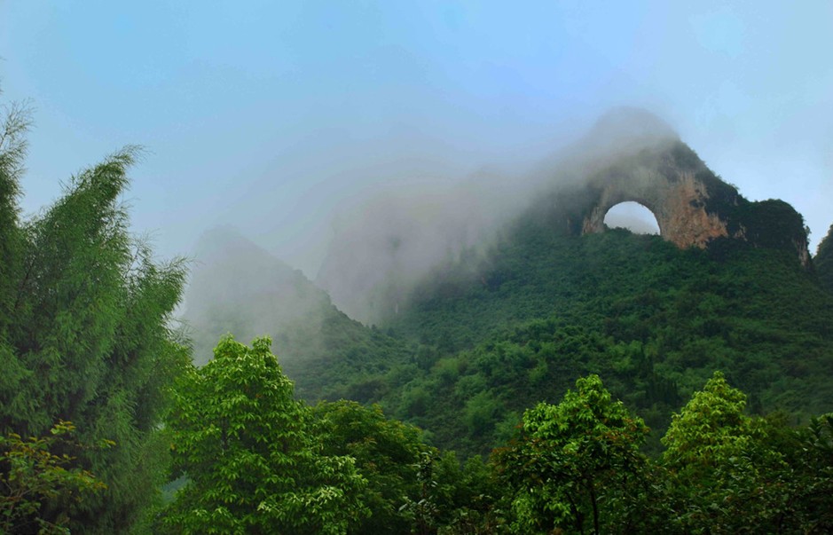月亮山位于位于廣西壯族自治區(qū)桂林市陽(yáng)朔縣十里畫廊景區(qū)末端。這里的風(fēng)光古樸素雅、恬靜安逸。山頭上有一個(gè)天然的大石拱,兩面貫通,遠(yuǎn)看酷似天上明月高掛。從不同的角度變換觀看,此洞形狀也不斷變化。