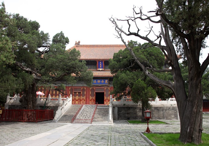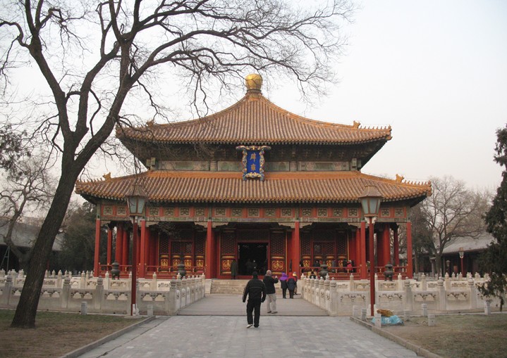 全國(guó)重點(diǎn)文物保護(hù)單位。位于北京城內(nèi)東城區(qū)國(guó)子監(jiān)街。占地2.2萬(wàn)平方米。歷代多次重修,為元、明、清三代祭孔建筑,又名"先師廟"。廟坐北朝南,大門稱先師門,仍保持元代風(fēng)格。前有琉璃壁及下馬碑,進(jìn)門東西有碑亭、神廚、神庫(kù)等,并立有元、明、清三代進(jìn)士題名碑118 方,題刻歷代進(jìn)士5萬(wàn)多名。進(jìn)大成門至第二進(jìn)院,正殿名大成殿,為孔廟主體建筑,面闊9間,進(jìn)深5間,黃琉璃筒瓦重檐廡殿頂,殿前月臺(tái)三出陛,殿內(nèi)供奉孔子及"四配"、"十二哲"。殿前有600余年樹齡的古柏一株,名"除奸柏",亦名"觸奸柏"。有古井一口,清高宗賜名"硯水湖"。大成殿后有崇圣祠,自成院落,為祭祀孔子先祖之地。今辟為首都博物館,展出北京地區(qū)出土的歷代珍貴文物。