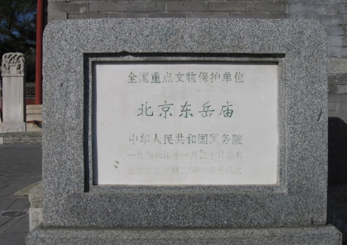 全國(guó)重點(diǎn)文物保護(hù)單位。位于北京市區(qū)東部朝陽(yáng)區(qū)朝陽(yáng)門外神路街。占地約6萬(wàn)平方米,是道教正一派在華北地區(qū)最大的廟宇。始建于元延?六年 (1319),由玄教大宗師張留孫和其弟子吳全節(jié)募資興建。至治三年(1323)完工,賜名東岳仁圣宮,主祀泰山神東岳大帝。清道光年間擴(kuò)建。廟坐北朝南,由正院、東院、西院三部分組成。正門前有高大雄偉的三洞七幢琉璃牌樓。正院建筑主要有山門、戟門(又稱瞻岱門、龍虎門)、岱宗寶殿(又名仁圣宮)、育德殿、玉皇殿。進(jìn)戟門始自左右再向北環(huán)繞的廡殿為地獄七十六司殿。再向北左有廣嗣殿、太子殿,右有阜財(cái)?shù)?、太子殿。岱宗寶殿左右有三茅真君祠堂、吳金?jié)祠堂、張留孫祠堂、山府君祠堂、蒿里丈人祠堂等。最后為后罩樓。東院原為花園,西院為規(guī)制不一的小型殿宇,多為民間善會(huì)修建。東岳廟雖經(jīng)重修,但其主體建筑仍保持元代風(fēng)格,廟內(nèi)以神像、石碑、楹聯(lián)眾多而享譽(yù)海內(nèi)外,趙孟頫書(shū)\"張?zhí)鞄熒竦辣?(俗稱道教碑)即存于廟中。正院已修葺一新,辟為北京民俗博物館,如今,于2008年5月3日,在黨和政府的推動(dòng)及支持下,北京東岳廟作為道教活動(dòng)場(chǎng)所正式登記開(kāi)放。