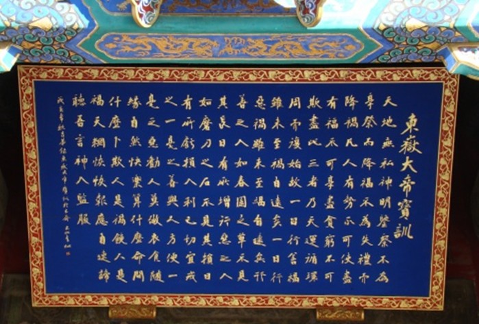 各殿前均掛有楹聯(lián)、匾額,集中體現(xiàn)了東岳信仰懲惡揚(yáng)善的精髓。楹聯(lián)多是東岳廟的一大特色景觀。原來(lái),廟內(nèi)多數(shù)殿堂前都掛有白底黑字、小篆字體的楹聯(lián)。它們既是對(duì)各殿各司神祇職能的詮釋,也是人們對(duì)理想生活的憧憬。在“善惡有報(bào)”的外衣下,楹聯(lián)的內(nèi)容折映出豐富的中國(guó)傳統(tǒng)倫理道德觀念。它們或言簡(jiǎn)意賅,發(fā)人深?。换蛏钊霚\出,雅俗共賞;或意蘊(yùn)悠長(zhǎng),蘊(yùn)含哲理,文化內(nèi)涵相當(dāng)豐富。