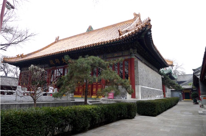 到廣濟寺朝禮的人們第一眼讓人注目的是天王殿。這里有明代仿唐三彩的四大天王,象征著“風調(diào)雨順”。中間為明代銅彌勒像,與各地寺院看到的“大肚能容,容天下難容之事;開口常笑,笑世間可笑之人”的布袋和尚像不同。布袋和尚只是傳說中彌勒佛的化身形象,廣濟寺天王殿中所供奉的是——天冠彌勒。廣濟寺最大的殿堂是“大雄殿”?!斗ㄈA經(jīng)•從地涌出品》:“善哉!善哉!大雄世尊”。大雄是佛陀的德號,即偉大之英雄之意。佛具大智慧,能降伏魔障,故稱大雄。廣濟寺大雄殿是帝王所敕建,故著黃琉璃瓦。殿脊有香水海,又名華藏世界海,整體呈山形,由水、蓮花和一個梵字構(gòu)成,寓意永恒世界、不生不死。此種殿脊在北京地區(qū)獨此一家。大雄殿所供奉的三世佛,即西側(cè)過去世迦葉佛,中間是現(xiàn)在世釋迦牟尼佛,東側(cè)是未來世的彌勒佛。這樣的組合供奉方式與常見寺院所供奉的西方世界阿彌陀佛、本師釋迦牟尼佛、東方世界藥師佛組合完全不同。佛是智慧之身,法性平等,所表達的合掌皈依仰慈悲,舉頭見佛生歡喜的精神完全相同。