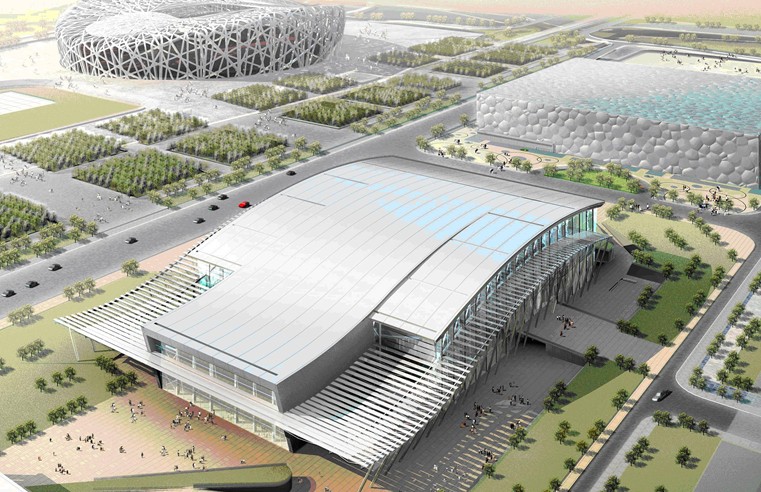 國家體育館國位于奧林匹克公園中心區(qū)的南部,與“鳥巢”和“水立方”和國家會議中心比鄰而居。國家體育館由主體建筑和與之相連的熱身館以及室外環(huán)境組成,賽時可容納觀眾約1.8萬人。