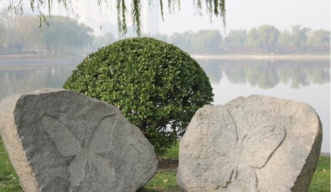 標題:《蝴蝶夢》材質:花崗巖。高度:1米。作者:錢瑞澤。 創(chuàng)意:這個作品主要表達一種環(huán)保意識,假借史前化石的虛擬形象對滅絕的史前昆蟲之回憶,來呼喚人們對自然 的愛護。同時,也嘗試地表現(xiàn)化石的質感美,擴大視覺美感的范圍,以試圖豐富雕塑的美感因素。安放在植物觀賞區(qū)東北側,時間2000年5月。