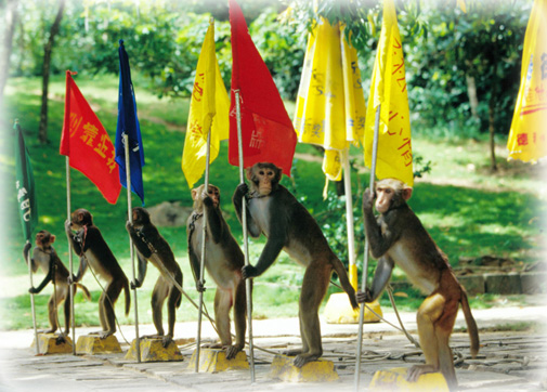 閑庭信步似的從容才是猴子們最為“尊敬”的態(tài)度。正是在這種從容中你已和猴子建立起相互尊重、相互信任的關(guān)系。當你做到這一點時,你就不會對在猴藝表演場上人猴同席觀看猴明星的雜技、小品表演的情形嘖嘖稱奇了,同時你也會充分享受到猴子們在你手上、腿上爭食、搶食,嬉鬧的樂趣。