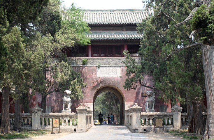 孔林二門神道長(zhǎng)約400米,神道兩側(cè)整齊排列著蒼檜翠柏,兩旁圍以紅墻。神道盡頭為孔林二門,門額石刻篆書“至圣 林”三字,系清雍正十年(1732年)敕修。