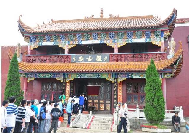 地處河北省滄州市北的青縣城南6公里有村曰“大盤古”,村西有座盤古廟。盤古廟始建于元世祖至元十五年(1278年),明弘治和崇禎年間曾重修,清康熙二十七年(1688年)因河流沖刷,設(shè)于秋祠西南重建,均有碑記。據(jù)文獻(xiàn)記載和民間傳說(shuō),當(dāng)年的盤古廟狀似北京的故宮三殿,石、磚、木結(jié)構(gòu),琉璃瓦蓋頂,金碧輝煌,蔚為壯觀。前殿高三丈六尺,象征一年360天;臺(tái)階18級(jí),為18層地獄之說(shuō);飛檐椽子108根,按36天罡、72地煞而布;每根椽頭系銅鈴一枚,照工、商、角、征、羽五音而置,有所謂“風(fēng)搖鈴響天動(dòng)樂(lè),光照殿頂?shù)厣x”之說(shuō)。殿內(nèi)有身披樹葉,手托日月的鐵鑄涂金盤古像,高一丈零八寸。中殿塑有南海觀音像,股坐蓮盆,金童玉女立兩側(cè)。版權(quán)所有山東聊城聊之旅國(guó)際旅行社有限公司,轉(zhuǎn)載必究!后殿設(shè)老君、孔子、龍王三塑像,殿前有合抱粗的合歡樹兩株,殿后鐵磬懸于古槐??上ПP古廟在1947年毀于戰(zhàn)火。九十年代,當(dāng)?shù)厝罕娊M織起來(lái)修復(fù)盤古勝跡,以滿足來(lái)此朝圣拜祖的人流尋訪。