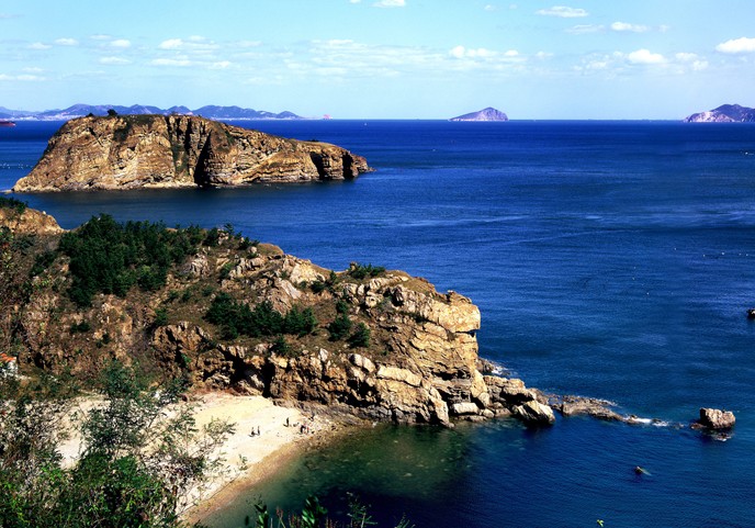 景區(qū)北部為群山環(huán)繞,蒼松翠柏。南面是開闊的海域和平坦的沙灘,遠處的三山島,云遮霧罩,恍如蓬萊。 島上岸崖陡峭,怪石嶙峋,山花野草遍及全島。