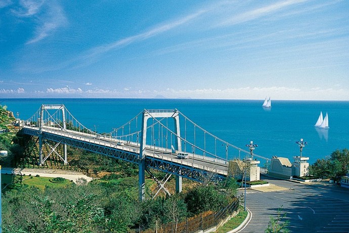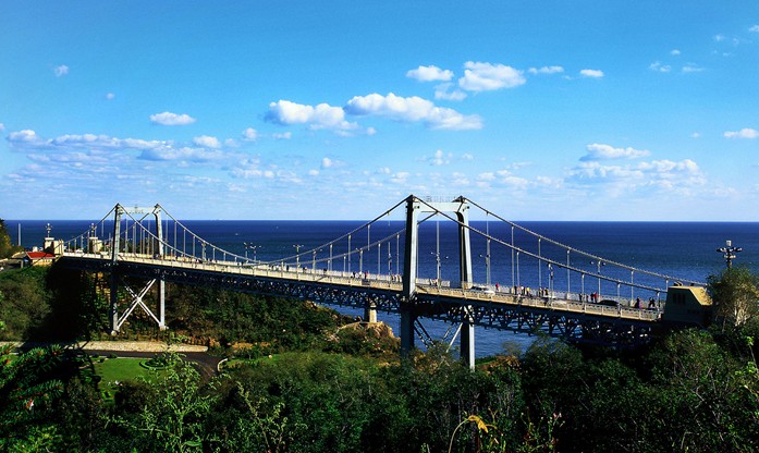該橋1984年5月開工,三年后正式通車。雄偉的橋臺(tái),高高的橋塔架聯(lián)接著長(zhǎng)長(zhǎng)的主鋼索,通過吊索使一個(gè)平展的橋面穿狹谷而過,氣勢(shì)雄偉,磅礴蒼勁,像一高大巨人雙臂把兩座山嶺聯(lián)接起來。過了北大橋繼續(xù)向西走,就來到了燕窩嶺景區(qū)和秀月峰景區(qū)。 位于大連市濱海路上,全長(zhǎng)228米,三跨鋼懸索橋,主跨132米,邊跨2*48米,寬12米,主塔為鋼箱截面,混凝土重力錨錠,造價(jià)1400萬元。版權(quán)所有山東聊城聊之旅國(guó)際旅行社有限公司,轉(zhuǎn)載必究!橋梁全長(zhǎng)228米,中跨132米,邊跨2*48米 。 橋面寬12米,其中車行道9米,人行道2*1.5米 。橋上雙向兩車道,橋上縱坡 0%。三跨懸索橋,跨徑為48米+132米+48米,加勁梁為鋼桁架,梁高3米 • 主塔為鋼箱截面,混凝土重力錨碇 .