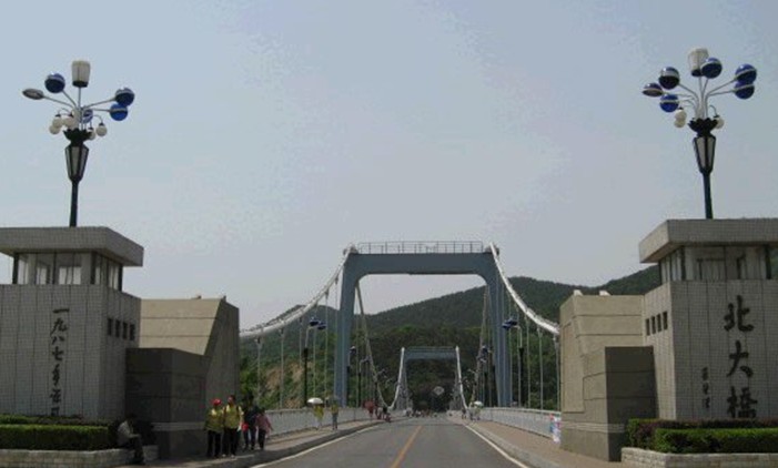 北大橋位于大連海濱風(fēng)景區(qū)中的老虎灘景區(qū)與燕窩嶺景區(qū)之間,是一座近海臨山橫跨山谷的旱橋。它是貫穿整個(gè)大連海濱風(fēng)景區(qū)東西濱海路的要沖,而且也是老虎灘景區(qū)西部和鄰近的燕窩嶺景區(qū)中一壯觀秀麗的風(fēng)景點(diǎn)。 該橋?yàn)槿绾?jiǎn)支加勁桁架懸索橋,全長(zhǎng)230米,中跨跨徑132米,橋?qū)?2米,其中車行道寬為8米。主索矢高13.2米,矢跨比1:10。