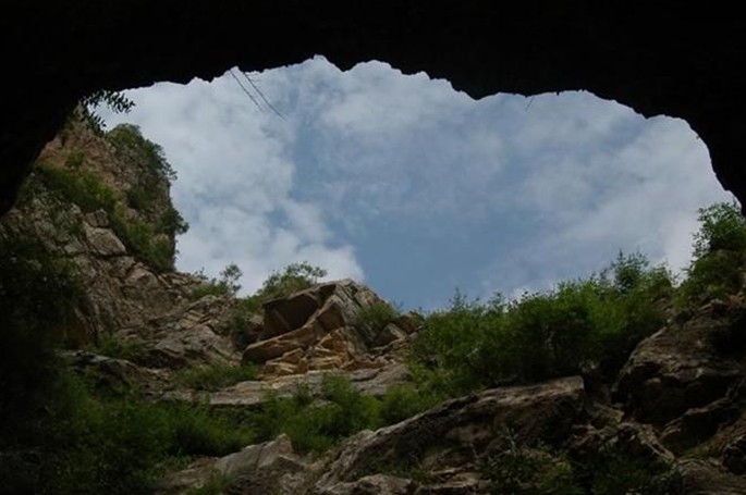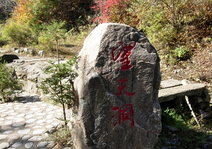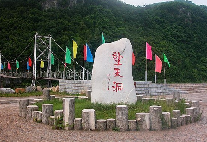 望天洞位于雅河鄉(xiāng)彎彎川村東70余米高的山頂上。該洞發(fā)育于20萬年前,洞總長 7000余米,洞內(nèi)最大的廳6000余平方米,可容納萬人。全洞4大景區(qū)100余景點。洞內(nèi)的迷宮更為奇特,被稱為“北國第一洞,迷宮世無雙”。此洞兩個洞口并列,中間一道兩抱多粗的石梁。右側(cè)洞口有50平方米,洞口石壁上一只展翅昂首的大鳥,面向東方,形象逼真,名曰“鯤鵬朝陽”。左側(cè)洞口有35平方米。兩個洞口酷似一副巨大的眼鏡放在山巔。沿左側(cè)洞口石壁扶鐵欄踏石階經(jīng)“通天橋”,下行30余米,便是該洞的第一大廳--“聚仙廳”,寬闊高大,可納千人?;厥籽鐾?,兩道光柱直射廳中,使人有懷抱紅日、目接青天之感。若在春冬季節(jié)或雨、雪之后,廳內(nèi)云霧繚繞,從洞口向上升騰,云霧與洞口綠樹交相輝映,更是妙不可言。