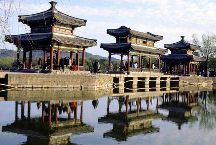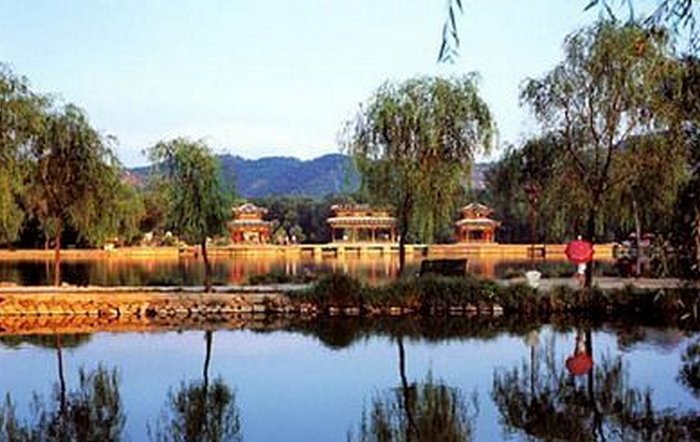 其中,清音閣:俗稱大戲樓。與北京圓明園同樂園中的戲臺同名,與現(xiàn)存故宮暢音閣、頤和園中德和園大戲樓形式相近。閣高三層,外觀雄偉。結(jié)構(gòu)精巧,閣內(nèi)布景逼真,音響效果很好。清音閣平面方三間,樓閣三重,舞臺寬17米,進深15米。清音閣的三層樓,上層稱“福臺”,懸掛“清音閣”三字御制匾額 中層名“祿臺”,額題“云山韶渣”;下層曰“壽臺”,額題“響葉鈞天”,取“福祿壽三星吉祥”之意。壽臺的天棚上有天井,地板下有五口地井,其中除一口水井有水外,其余均為枯井。在舞臺下設(shè)置這些地井,是為了增強舞臺上的音響共鳴效果。有時也配合劇情,適當使用舞臺設(shè)施,如由三樓布成天降大雪情景,佛自天降也是從三樓懸系下來的,而菩薩渡海、妖魔破土而出則從舞臺下的地井內(nèi)上來的。水井也能配合劇情引水上臺。