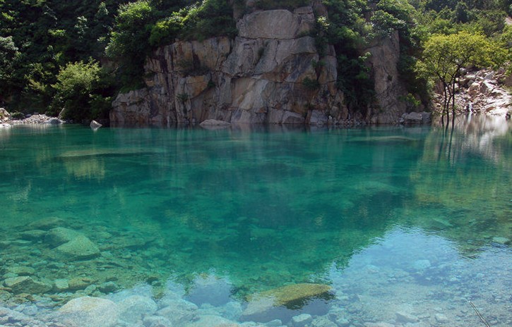 一水始自孫家村村東之菊灣,南有玉筍峰,北有黑虎山,兩山相夾,中為大澗,澗底巨石交錯,姿態(tài)萬千。二水澗中大石壘迭,排空壁立。澗南有巨巖,名錦屏巖,石色蒼翠。巖下潭水,錦巖倒影,波光漣漪三水于1967年建三水水庫,為九水新景。水清澈靛藍,從溢洪壩頂凌空跌落,如珍珠壁簾,晶瑩奪目。