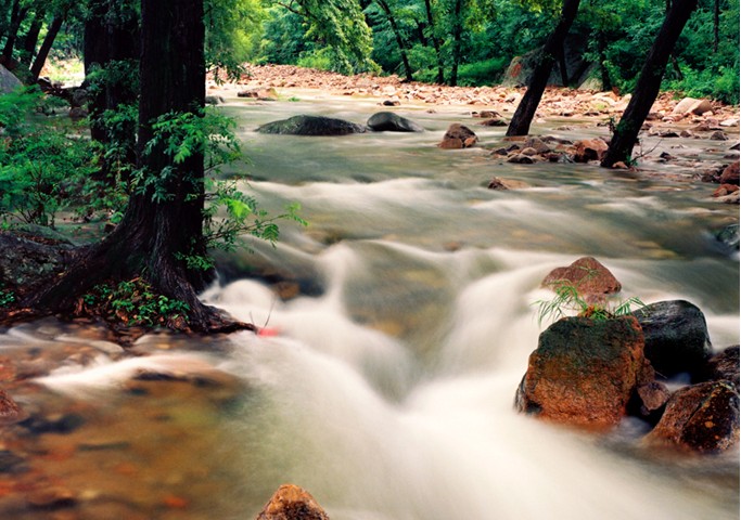 北九水以其麗山秀水繪就的優(yōu)美畫廊,馳名中外。嶗頂源泉之水從海拔1100多 米的高峰順勢而下,中途又匯集了眾多的溪流,凌空瀉入靛缸灣,又從靛缸灣溢出,沿著長長的深山峽谷,彎彎曲曲,時急時緩,時聚時散,奔騰而下。這樣一來,再配以兩側(cè)群峰聳峙,禽鳥啼鳴,奇光薈萃,綠樹成蔭,山與水相互纏繞,形成了一步一景、一灣一色的瑰麗畫廊風(fēng)光。