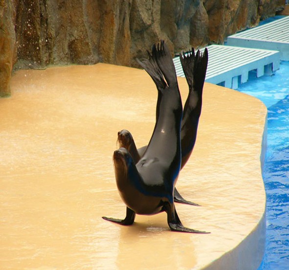 1997年5月從烏拉圭引進的4頭南美海獅(分別起名為“歡歡”、“樂樂”、“海海”、“琴琴”)更是非常聰明、可愛,是海獸表演家庭的幽默大師,別看它們其貌不揚,可在馴養(yǎng)師的嚴格訓練下,也能表演“握手”、親吻、問候、套圈、學人走路、鼓掌、再見、翻滾以及高難度的“頂球”、“單手倒立”、“一獅兩球”、《海獅學?!返冉?0余個精彩節(jié)目,其幽默滑稽的表演,令觀眾捧腹大笑。